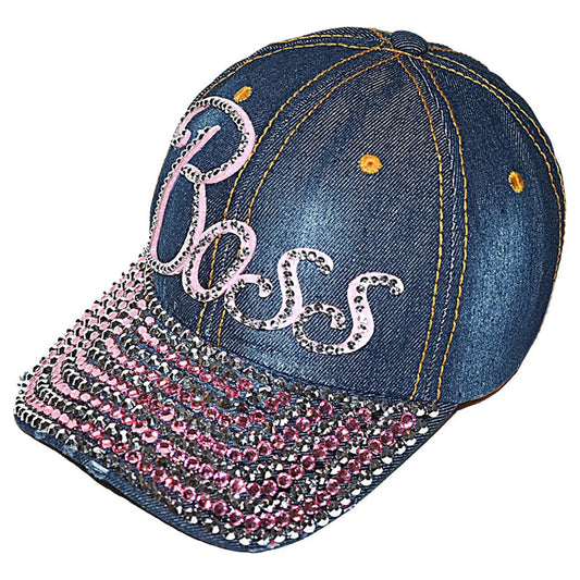 Bling Boss Rhinestone Denim Baseball Hat, Sassy Blue Distressed Cap for Women, Adult